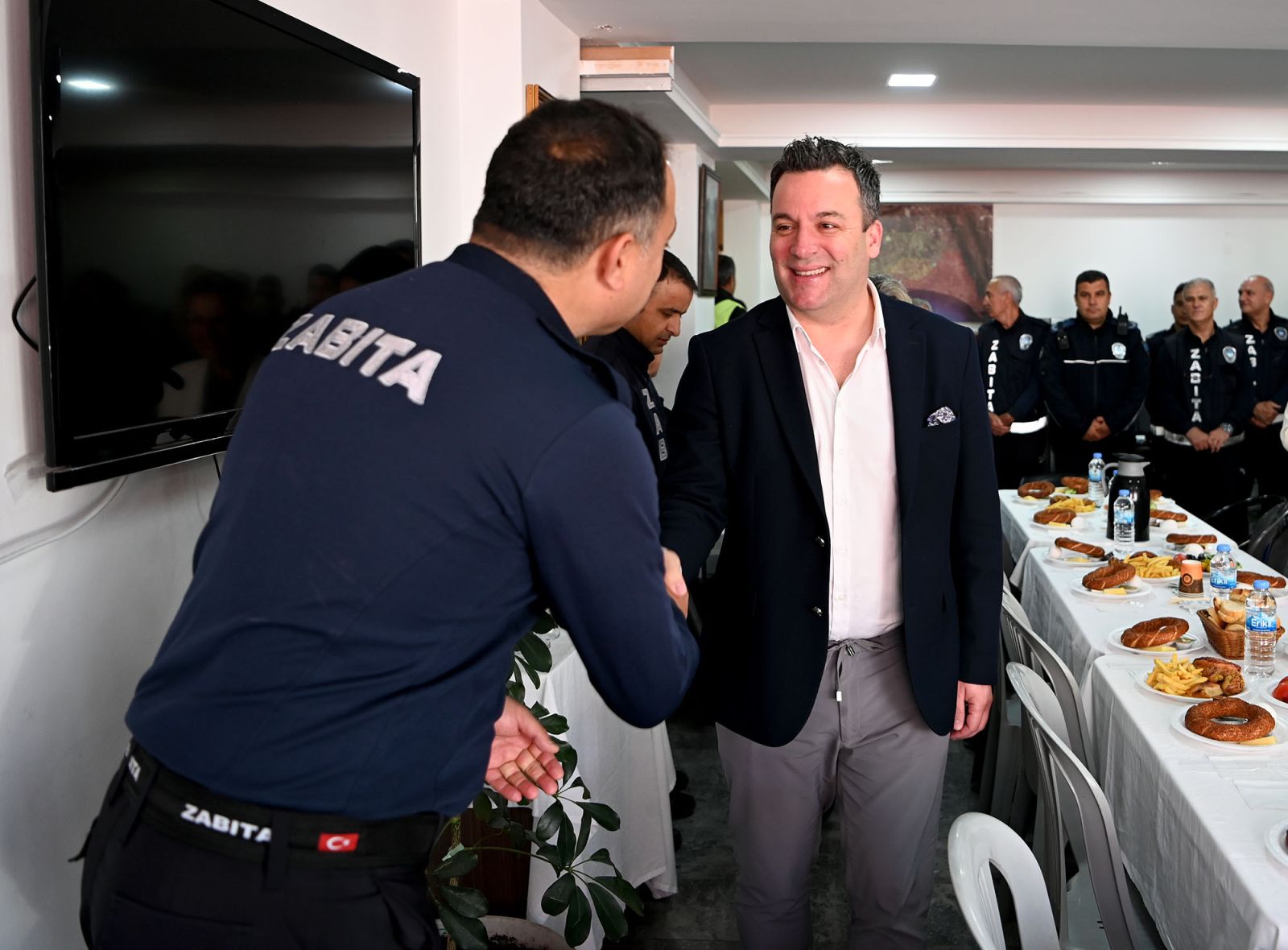 Başkan Vekili Tahsin Demirtaş güne Kuşadası Belediyesi Zabıta Müdürlüğü’nü ziyaret ederek başladı. Zabıta personeliyle birlikte kahvaltı yapan Başkan Vekili Demirtaş’a Kuşadası Belediye başkan yardımcıları da eşlik etti. Samimi bir atmosferde geçen buluşmada, belediye hizmetlerinin sahadaki önemi ve ekip çalışmasının değeri vurgulandı. Zabıta Müdürlüğü’nün kent genelindeki çalışmaları hakkında bilgi alan Başkan Vekili Tahsin Demirtaş, özveriyle görevlerini yapan personele teşekkür etti.