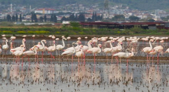 Her yıl olduğu gibi bu yıl da allı turna olarak bilinen flamingolar, Aydın’ın önemli tarım bölgelerinden Söke Ovası’na gelmeye başladı. Son günlerde etkili olan yağışların ardından su ile dolan tarlalara inen flamingolar eşsiz manzara oluştururken, Söke Ovası’nı şenlendirdi. İnce bacakları ve uzun boyunları ile tarlalarda balerin gibi süzülen flamingoların Söke Ovası’nda doğanın tüm güzelliğini ortaya çıkardığını ifade eden Ekosistemi Koruma ve Doğa Sevenler Derneği (EKODOSD) Başkanı Bahattin Sürücü, endüstriyel atıkların ve çevre sorunlarının habitat kaybına yol açtığına dikkat çekti.
