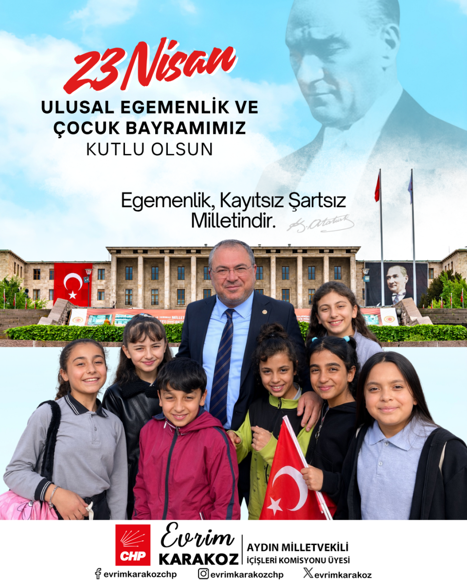 Cumhuriyet Halk Partisi Aydın Milletvekili Evrim Karakoz, 23 Nisan Ulusal Egemenlik ve Çocuk Bayramı mesajında “Geleceğimiz çocuklarımıza bırakacağımız en değerli miras, adil, özgür ve demokratik bir Türkiye'dir” derken millet iradesine gölge düşüren her türlü baskı ve adaletsizlikle mücadeleyi kararlılıkla sürdüreceklerini ifade etti.