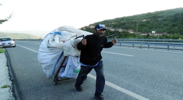 Yaya olarak 350 kilometre yol yapan Erol Adıyaman, hem karayolu kenarındaki teneke hurda kutuları temizliyor, hem de para kazanıyor. Ekmek parası için yollara düştüğünü belirten vatandaş, Muğla’dan Aydın, İzmir, Afyonkarahisar, Uşak ve tekrar Antalya’ya ulaşmayı hedefliyor. Geceleri el arabasında bulunan çadırında yatıp kalktığını belirten Erol Adıyaman, iş yok diyenlere ‘Yollarda iş çok’ diye cevap veriyor. Yollarda özellikle rampa çıkışlarda kendisine motosiklet ile el arabasını çekmek için yardımcı olan vatandaşlara teşekkür eden Adıyaman, yoluna devam ediyor.
