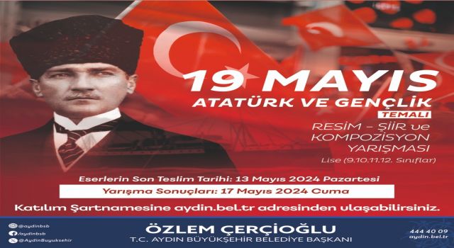 Büyükşehir Belediyesi’nin düzenleyecek olduğu yarışmaya; lise öğrencileri katılabilecek. Gençler, Ulu Önder Mustafa Kemal Atatürk tarafından kendilerine armağan edilen bu özel günde yeteneklerini ortaya koyacaklar. Yarışma sonuçları 17 Mayıs tarihinde www.aydın.bel.tr web adresinden duyurulacak. Aydın Büyükşehir Belediye Başkanı Özlem Çerçioğlu, gençlerin yetenekleri ile fark oluşturan eserler ortaya çıkaracaklarına inandığını belirterek, gençleri yarışmaya katılmaya davet etti.