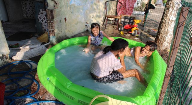 Aydın’ın Efeler ilçesinde yaşayan 5 çocuk annesi Arzu Özen, sıcaklardan bunalan çocukları için alternatif bir çözüm geliştirdi. Evinin önüne koyduğu şişme havuz ile çocuklarının serinlemesini sağlayan anne “Aydın çok sıcak bir memleket, bizim de havuza ya da denize gidecek durumumuz olmadığı için böyle bir çözüm buldum” dedi.