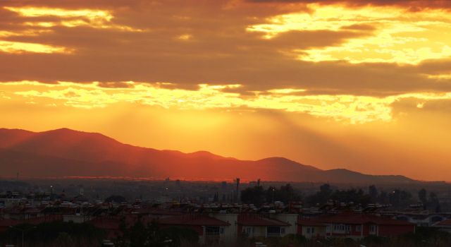 Aydın’da dün akşam saatlerinde başlayan yağmur, yüksek kesimlerde yerini kar yağışına bıraktı. Kar yağışı ile birlikte hava sıcaklıklarında da düşüş yaşandı. Türkiye’nin en sıcak şehirlerinden biri olan Aydın’da gün batımı ise insanların içini ısıtmaya yetti. Ufukta bulutların arasından batan güneş, eşsiz bir manzara sunarken, doğanın renkleri bir kez daha mest etti. Gün batımındaki kırmızı, mavi, gri ve turuncu renkler, akşamın soğuğuna nazire yaparak, şehrin üstüne yansırken, vatandaşlar da doyumsuz manzaranın keyfini çıkardı. (iHA)