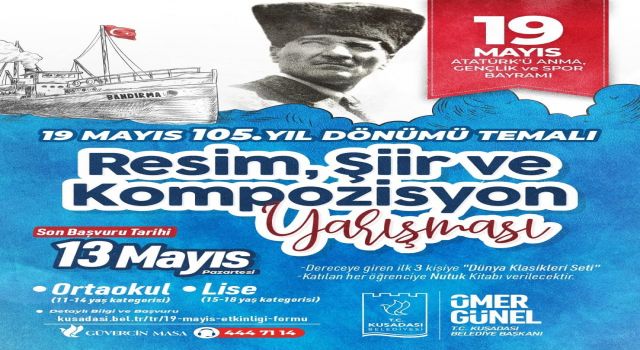 Kuşadası Belediyesi, Mustafa Kemal Atatürk’ün Samsun’a çıkışı ile başlayan ulusal kurtuluş mücadelesinin yıl dönümü olan 19 Mayıs Atatürk’ü Anma Gençlik ve Spor Bayramı nedeniyle 11-14 yaş kategorisini kapsayan ortaokul ve 15-18 yaş kategorisini kapsayan lise öğrencilerine yönelik bir yarışma düzenledi. “19 Mayıs’ın 105’inci Yılı” teması ile düzenlenen yarışma resim, şiir ve kompozisyon olmak üzere 3 ayrı dalda gerçekleşecek.