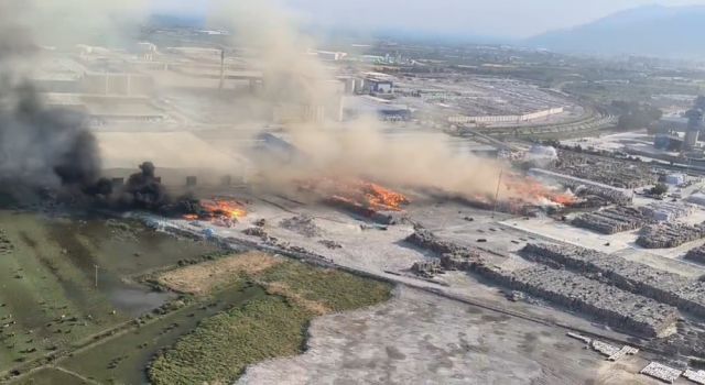 Söke ilçesindeki kağıt fabrikası geri dönüşüm alanında yangın çıkarken, yangına havadan ve karadan müdahale ediliyor.