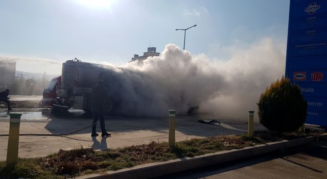 Olay, Manisa'nın Kula ilçesi 4 Eylül Mahallesinde bir benzin istasyonunda meydana geldi. Edinilen bilgiye göre, 34 HB 5123 çekici plakalı tırıyla Uşak'tan İzmir istikametine seyir halinde ola Aziz T. (56), tırın arka lastiklerinden duman çıktığını görünce yol kenarındaki bir benzin istasyonuna durdu. Tır sürücüsü yangın tüpü ile yanan lastiklere müdahale etmeye çalışırken, tırda bir anda patlama meydana geldi. Alevli bir şekilde yanmaya başlayan tırın altında kalmaktan son anda kurtulan tır sürücüsü yaralanırken, olay 112 Acil Çağrı Merkezi'ne bildirildi. Kısa sürede olay yerine gelen itfaiye ekipleri yanan tıra müdahale ederken, yangın petrol istasyonuna sıçramadan kontrol altına alındı.
