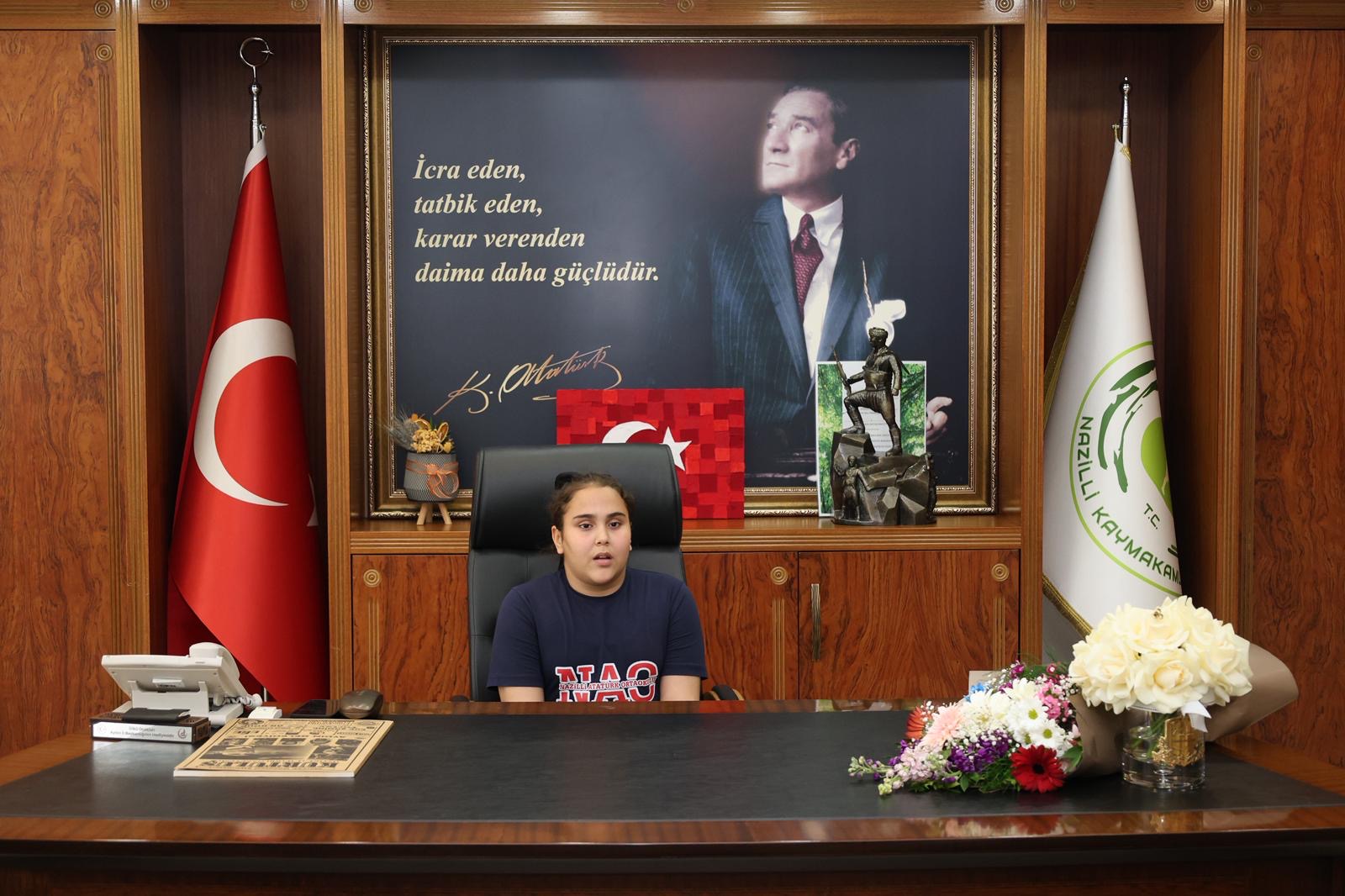 23 Nisan kapsamında Kaymakamlık makamı, temsili olarak Nazilli Atatürk Ortaokulu 5. sınıf öğrencileri Sinan Babacan ve Ayşe Sena Çulluca’ya devredildi. Kaymakamlık makamında gerçekleşen devir teslim töreninde öğrenciler kısa süreliğine kaymakamlık görevini üstlenirken, renkli ve gurur dolu anlar yaşandı.